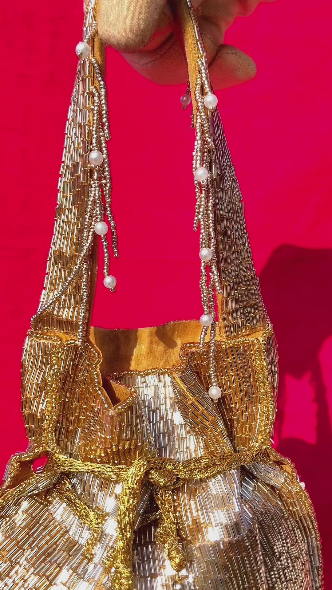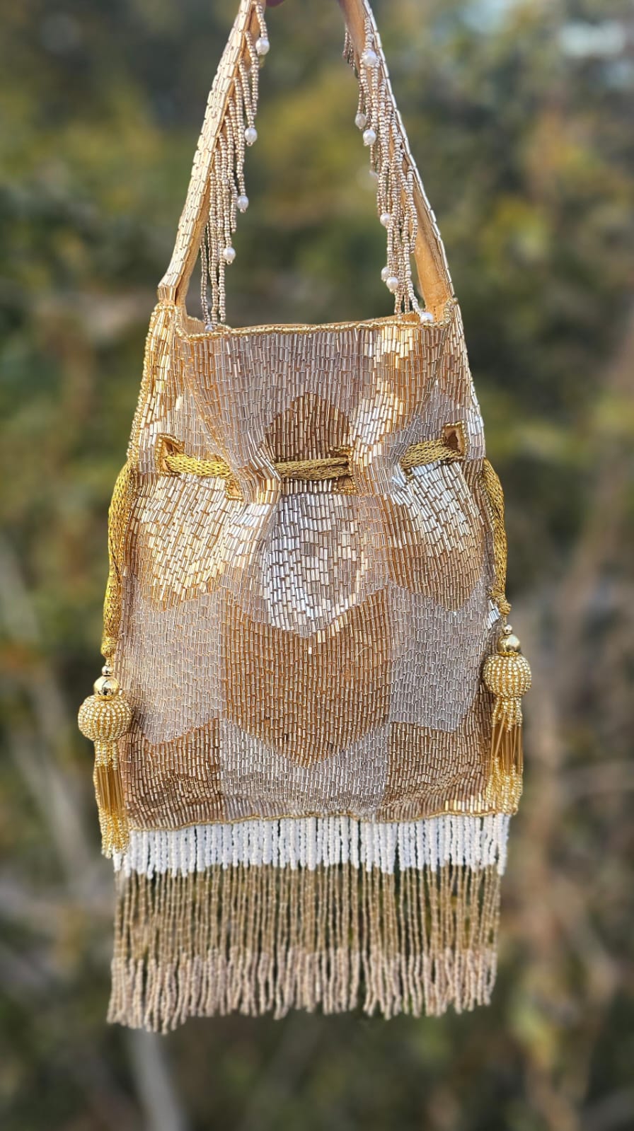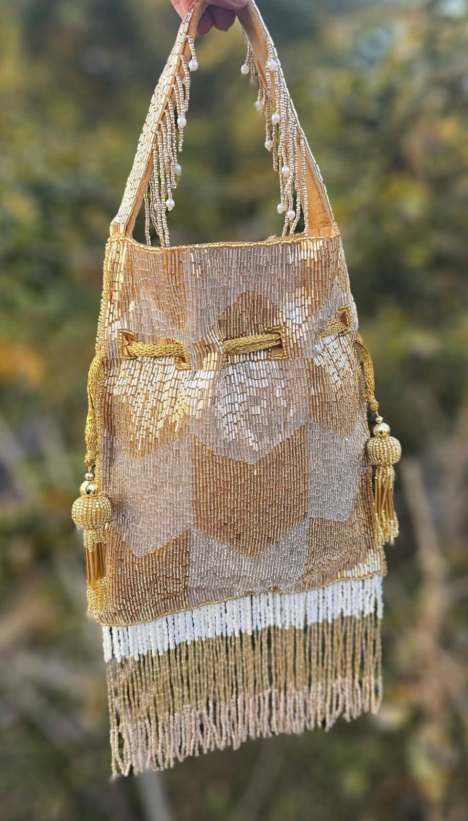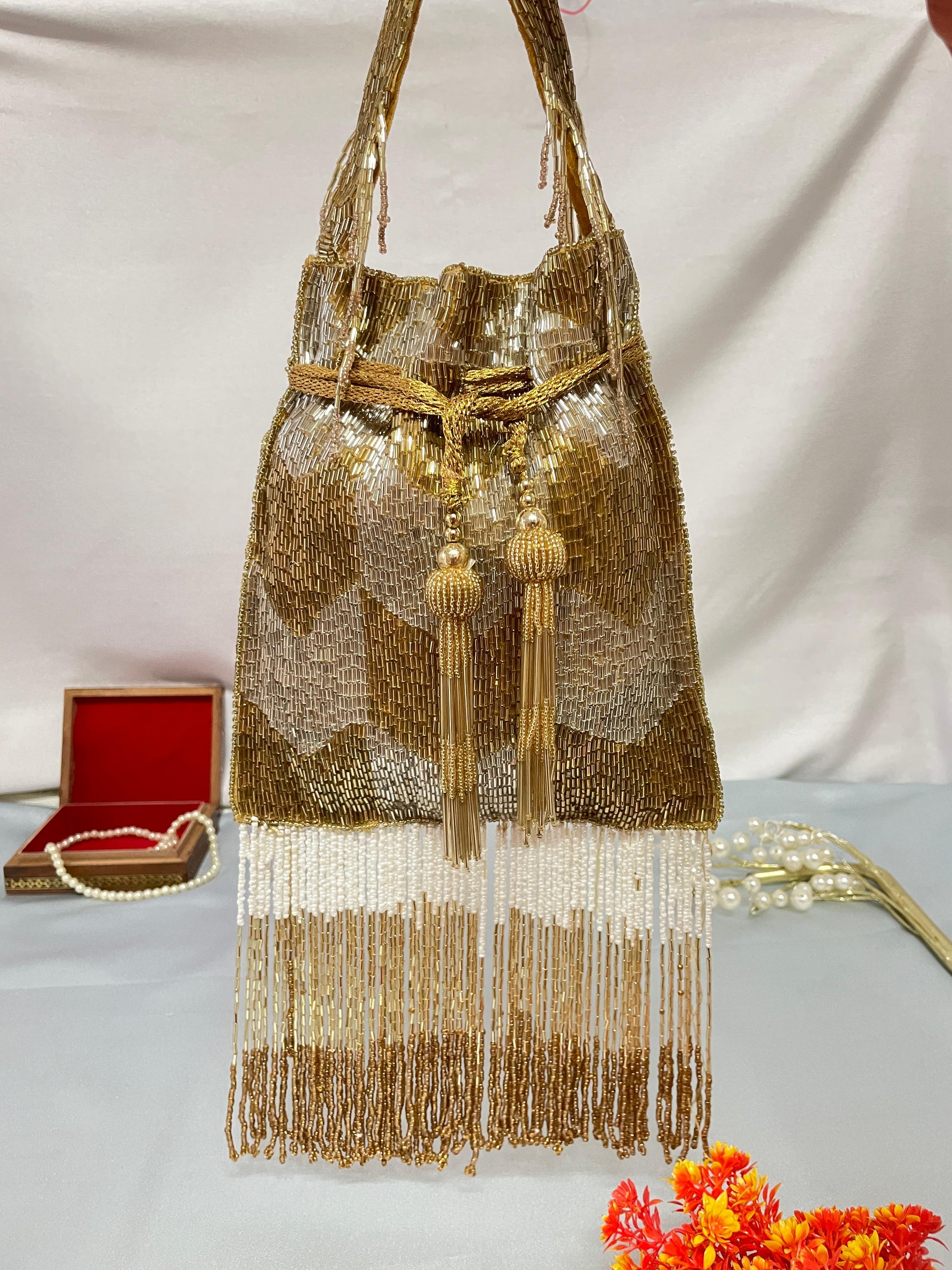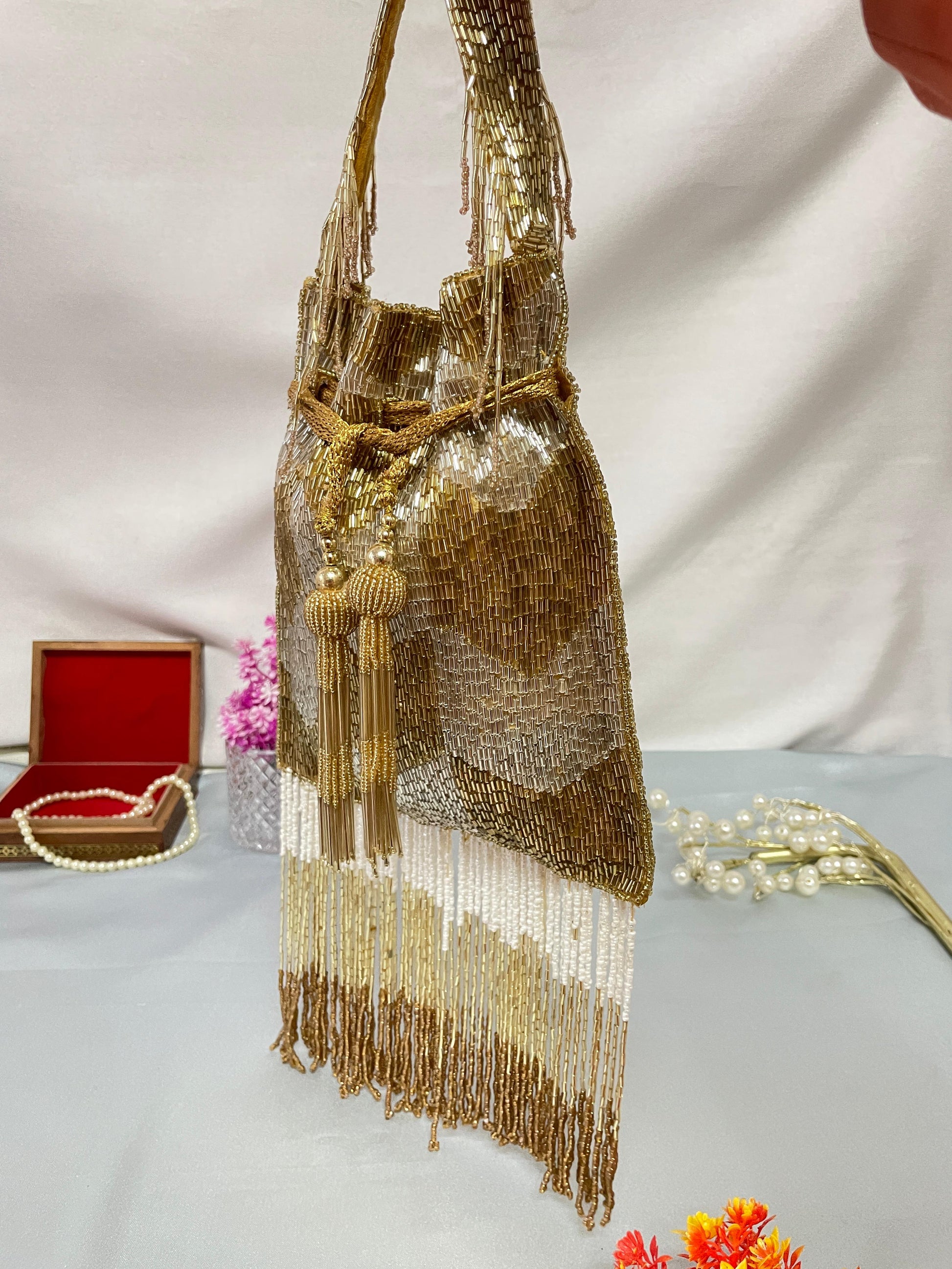 Golden drawstring with handcrafted bead tassels