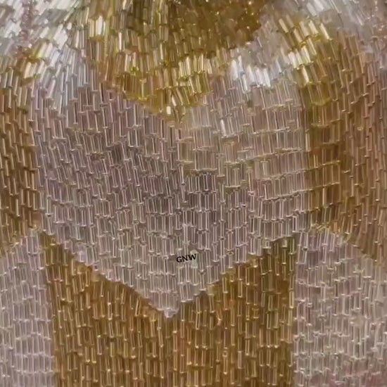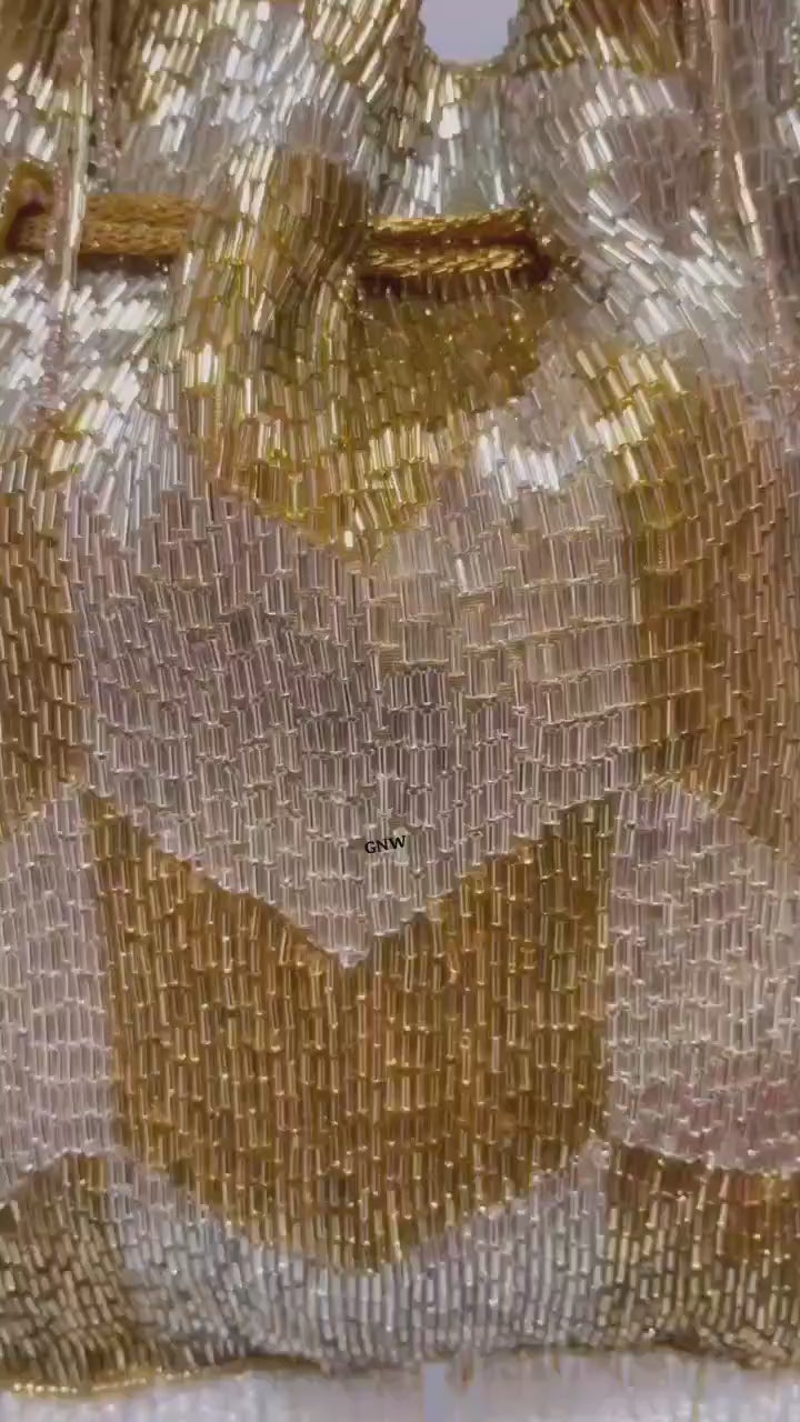 Elevate your ethnic look with this stunning handcrafted beaded potli from Trendy Crafts. Featuring a luxurious chevron pattern made with shimmering beads in shades of gold, ivory, lavender, mint, and pink, this potli is the perfect blend of elegance and tradition. The golden drawstring with intricate circular tassels adds a regal charm, making it ideal for weddings, parties, and festive occasions. Soft satin lining inside ensures your essentials are carried in style.
