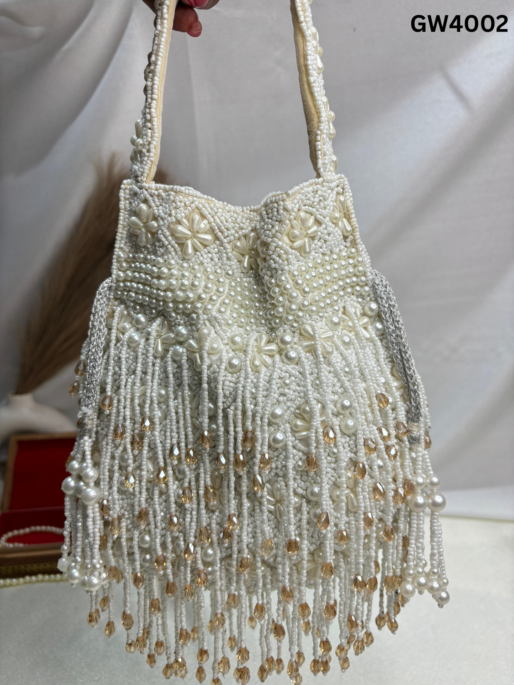 Elevate your ethnic look with this stunning handcrafted beaded potli from Trendy Crafts. Featuring a luxurious chevron pattern made with shimmering beads in shades of gold, ivory, lavender, mint, and pink, this potli is the perfect blend of elegance and tradition. The golden drawstring with intricate circular tassels adds a regal charm, making it ideal for weddings, parties, and festive occasions. Soft satin lining inside ensures your essentials are carried in style.