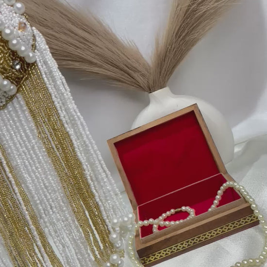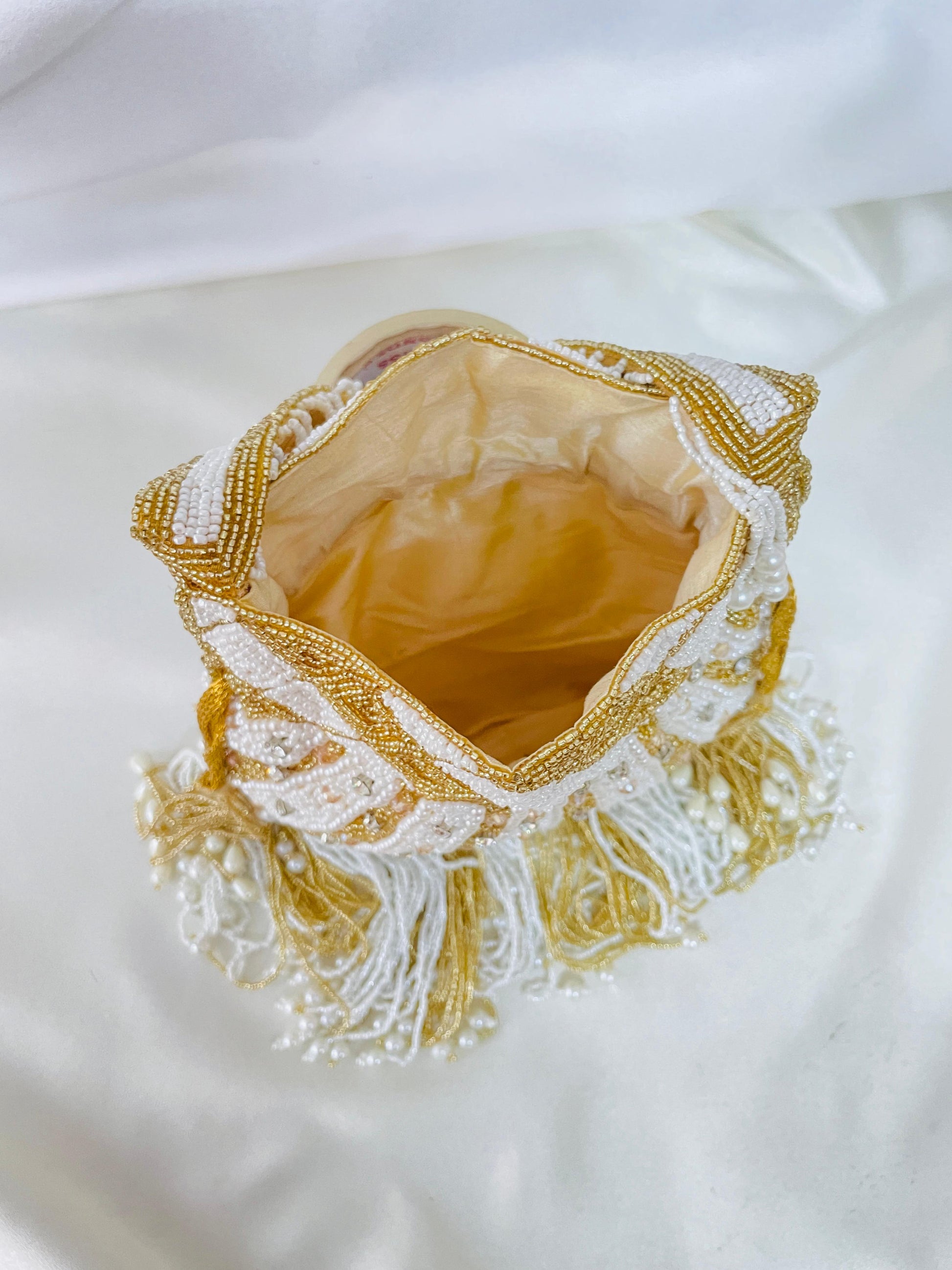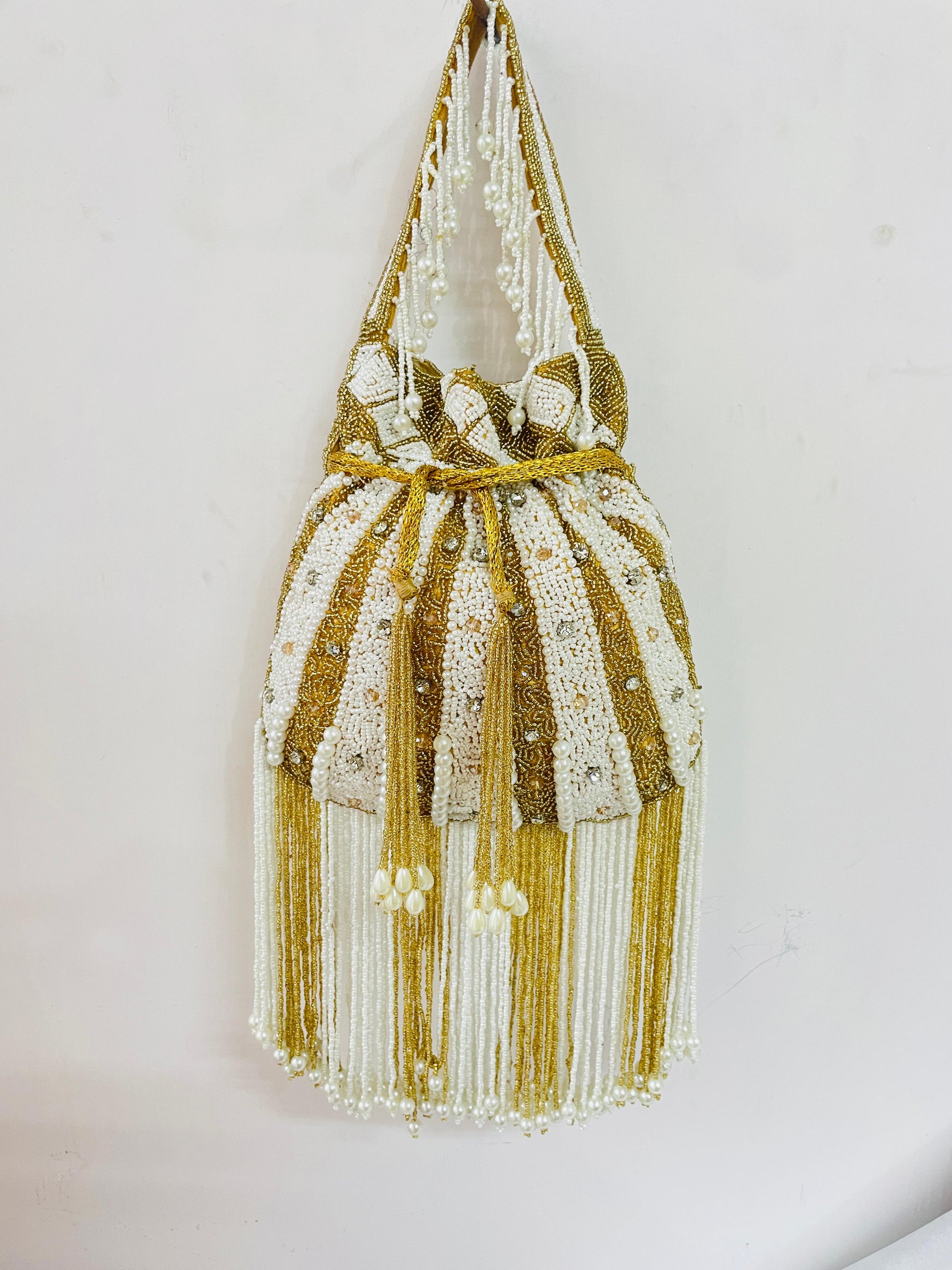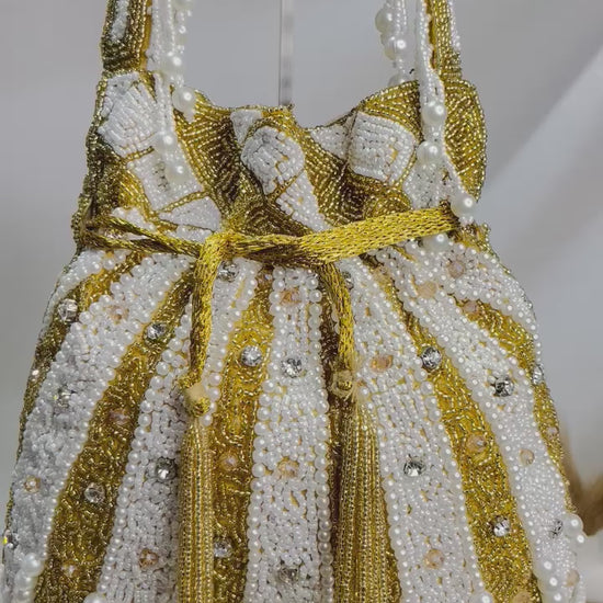 Make every celebration sparkle with the radiant charm of this Royal Pearl & nalki work Stripe Potli Bag. Meticulously handcrafted, this potli is a showstopper with its rich golden-and-white palette, intricate beadwork, and flowing tassels—perfectly designed for grand Indian occasions.