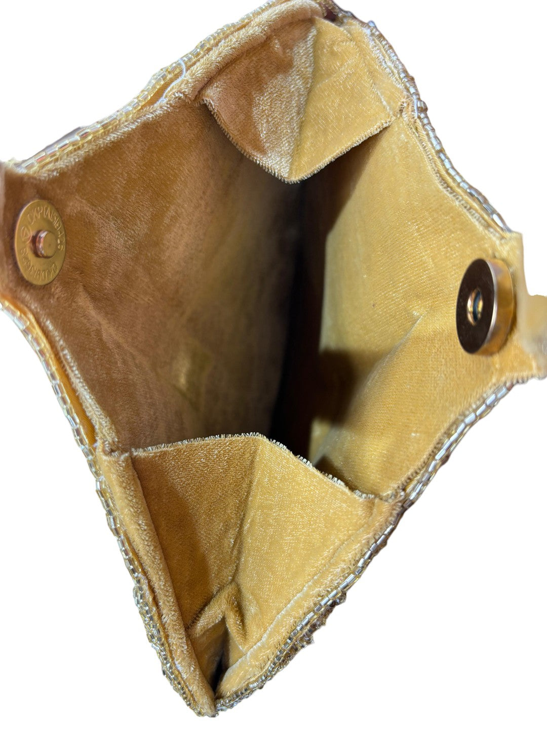 Gold Beaded Fringe Clutch with playful tassels and hidden button closure
