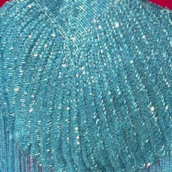 Trendy Crafts presents you this glamorous gold clutch bag: a perfect statement piece for a night out. Shimmering gold beads drape down the front of the bag in a fringe design, creating a dazzling and eye-catching effect.