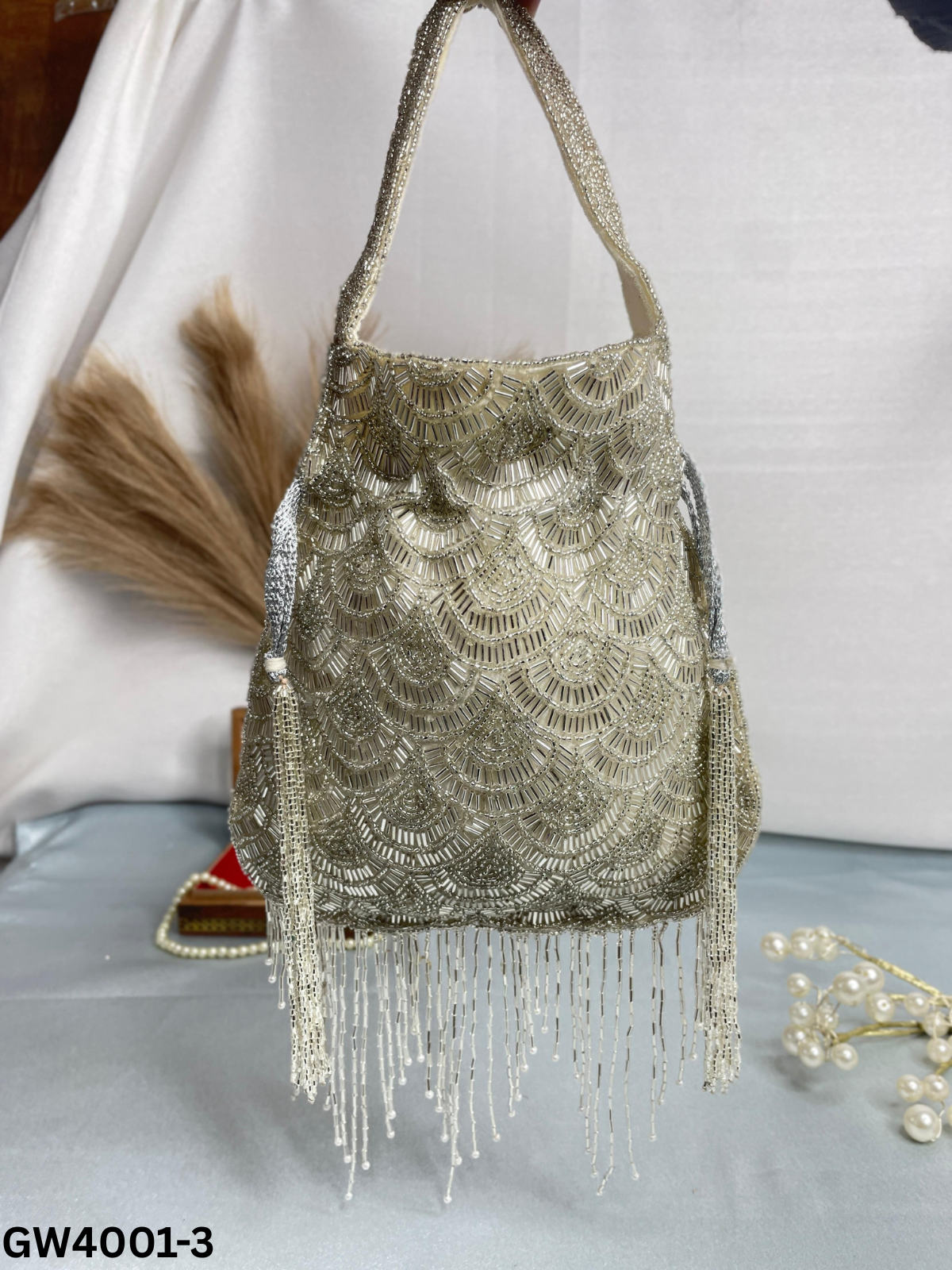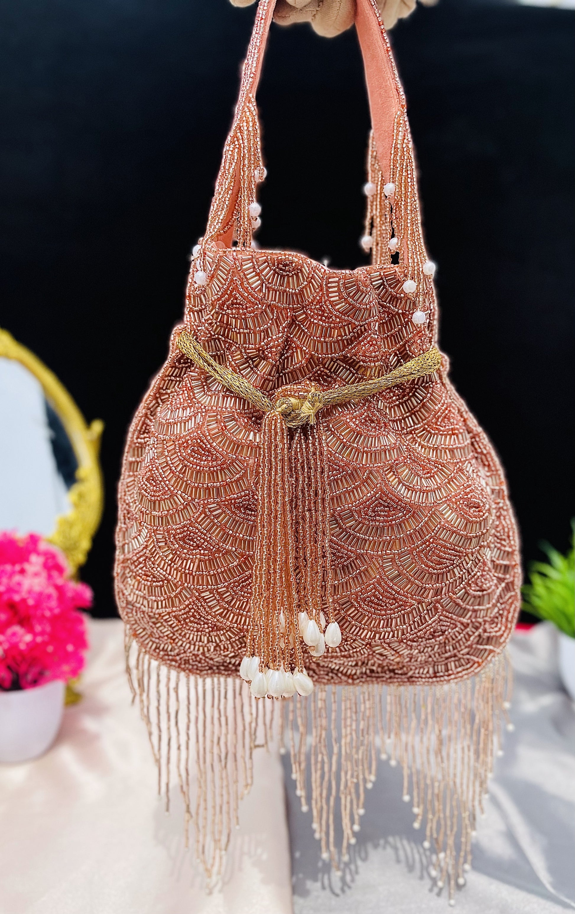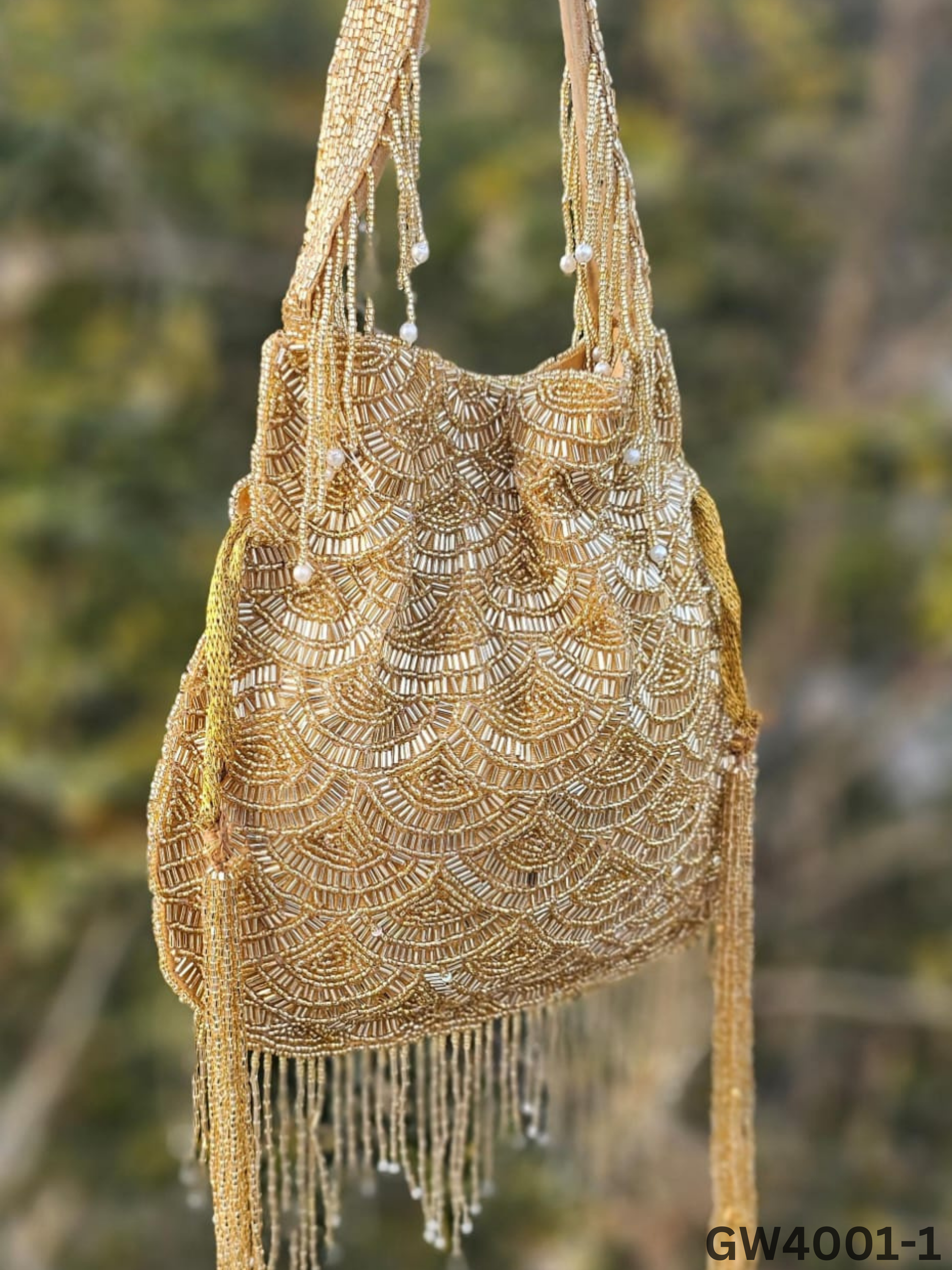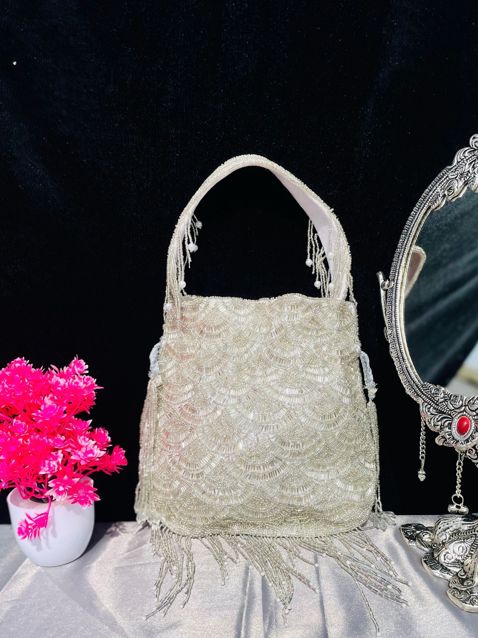 Elevate your ethnic look with this stunning handcrafted beaded potli from Trendy Crafts. Featuring a luxurious chevron pattern made with shimmering beads in shades of gold, ivory, lavender, mint, and pink, this potli is the perfect blend of elegance and tradition. The golden drawstring with intricate circular tassels adds a regal charm, making it ideal for weddings, parties, and festive occasions. Soft satin lining inside ensures your essentials are carried in style.
