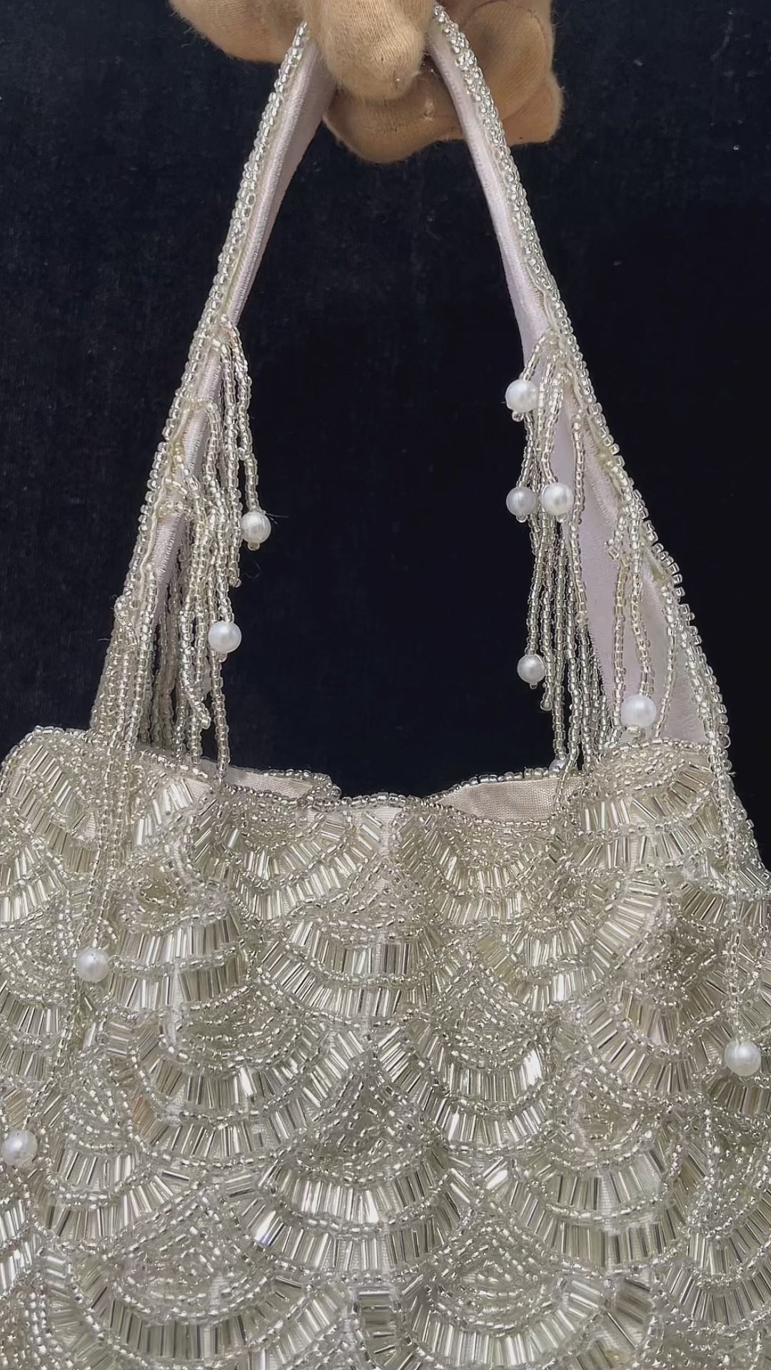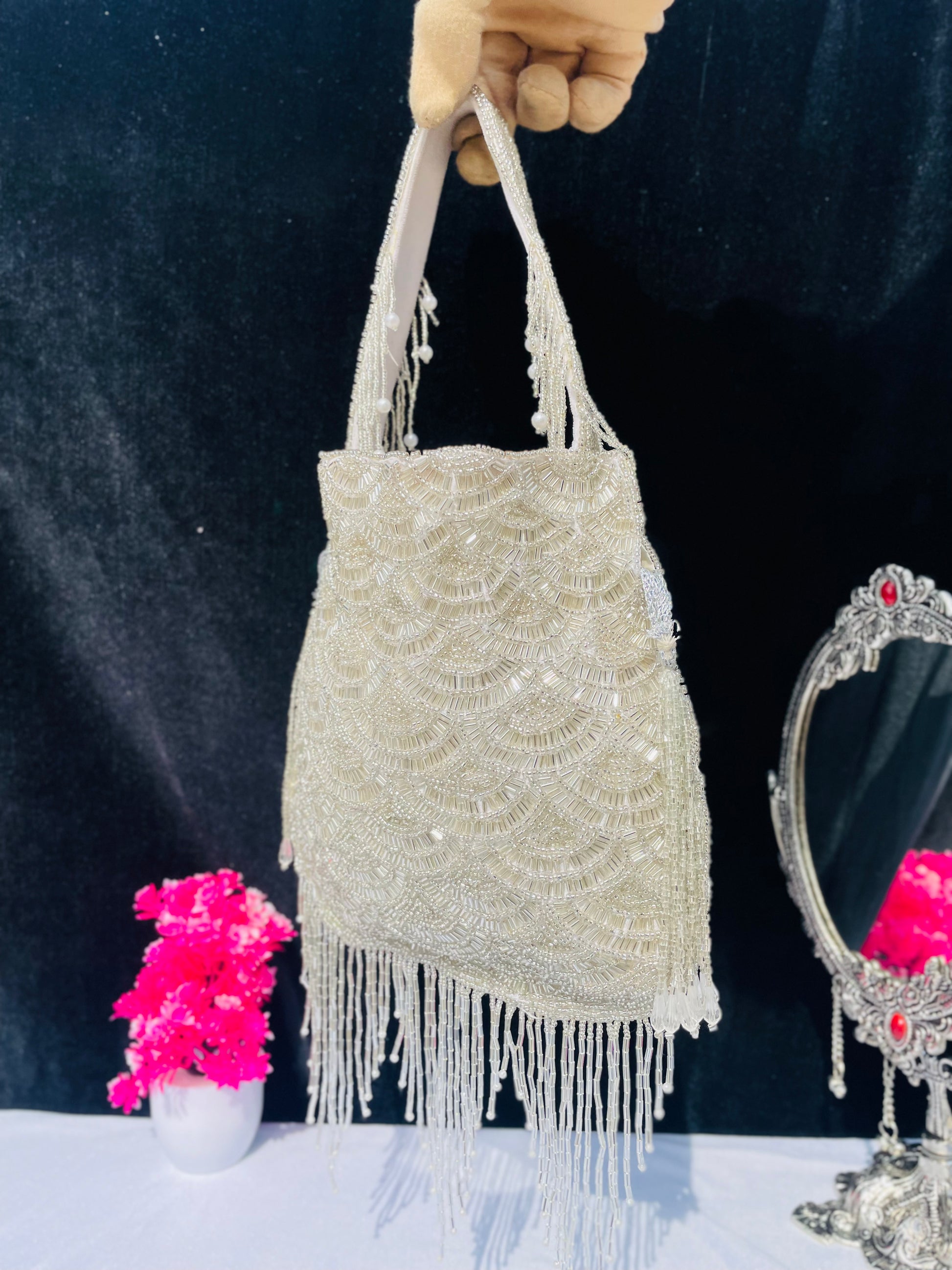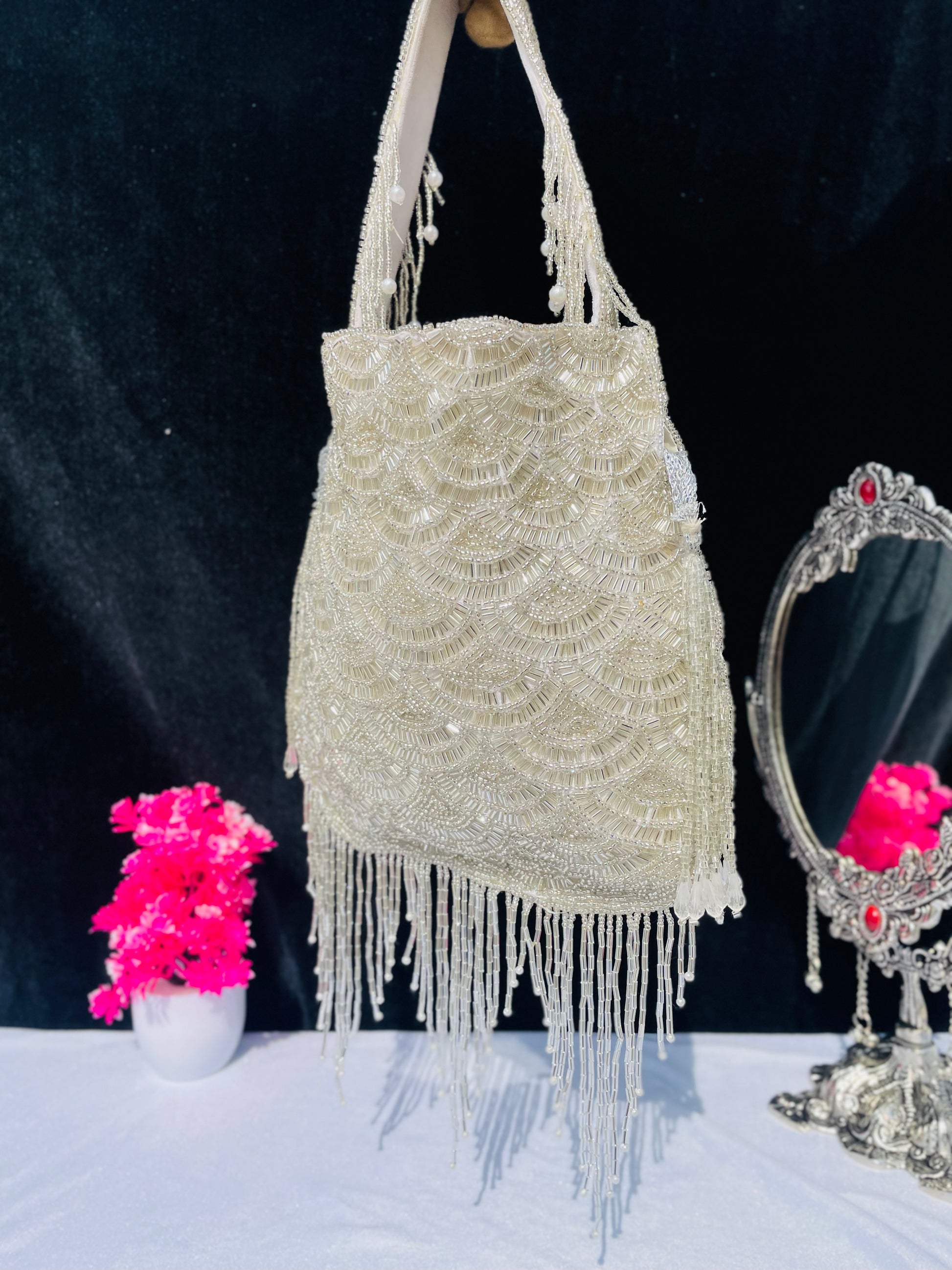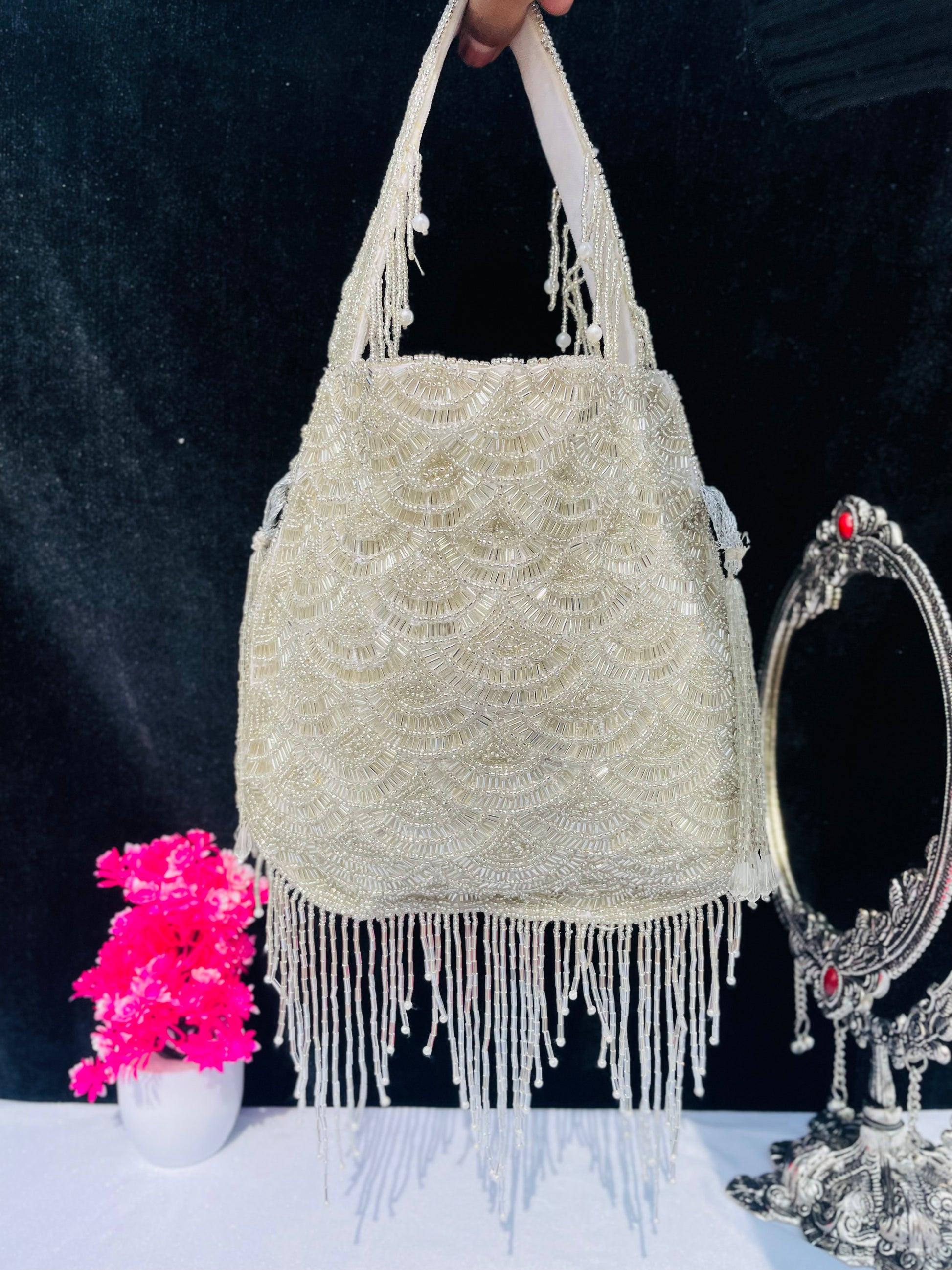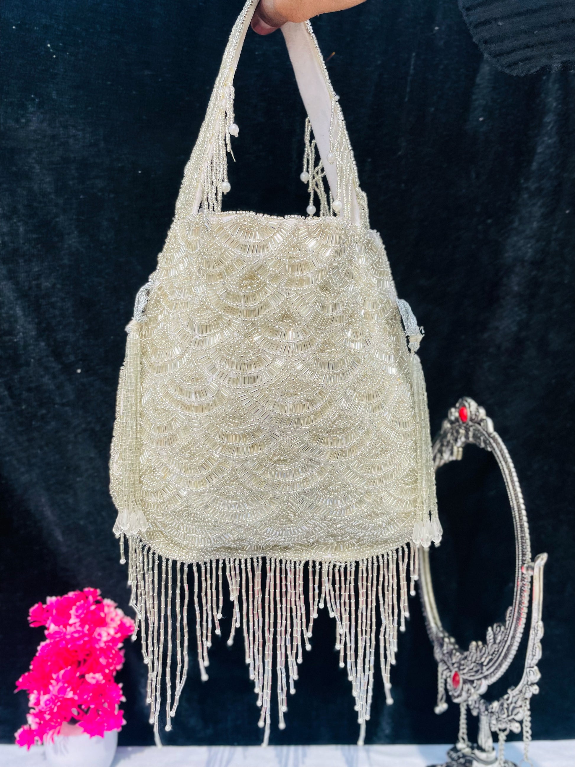 Elevate your ethnic look with this stunning handcrafted beaded potli from Trendy Crafts. Featuring a luxurious chevron pattern made with shimmering beads in shades of gold, ivory, lavender, mint, and pink, this potli is the perfect blend of elegance and tradition. The golden drawstring with intricate circular tassels adds a regal charm, making it ideal for weddings, parties, and festive occasions. Soft satin lining inside ensures your essentials are carried in style.