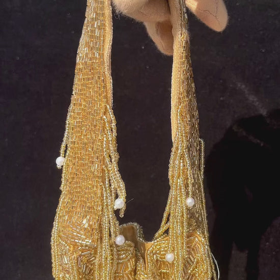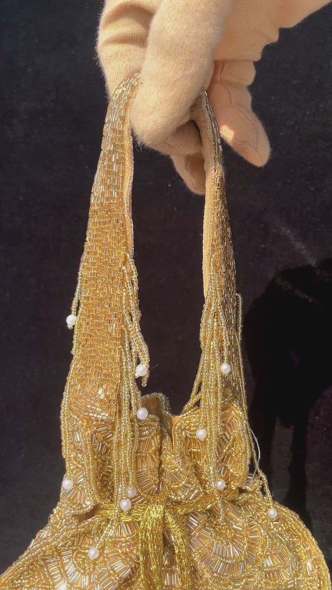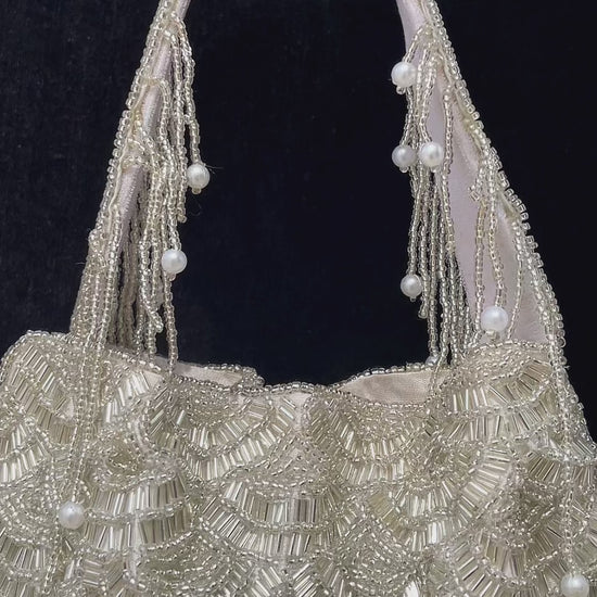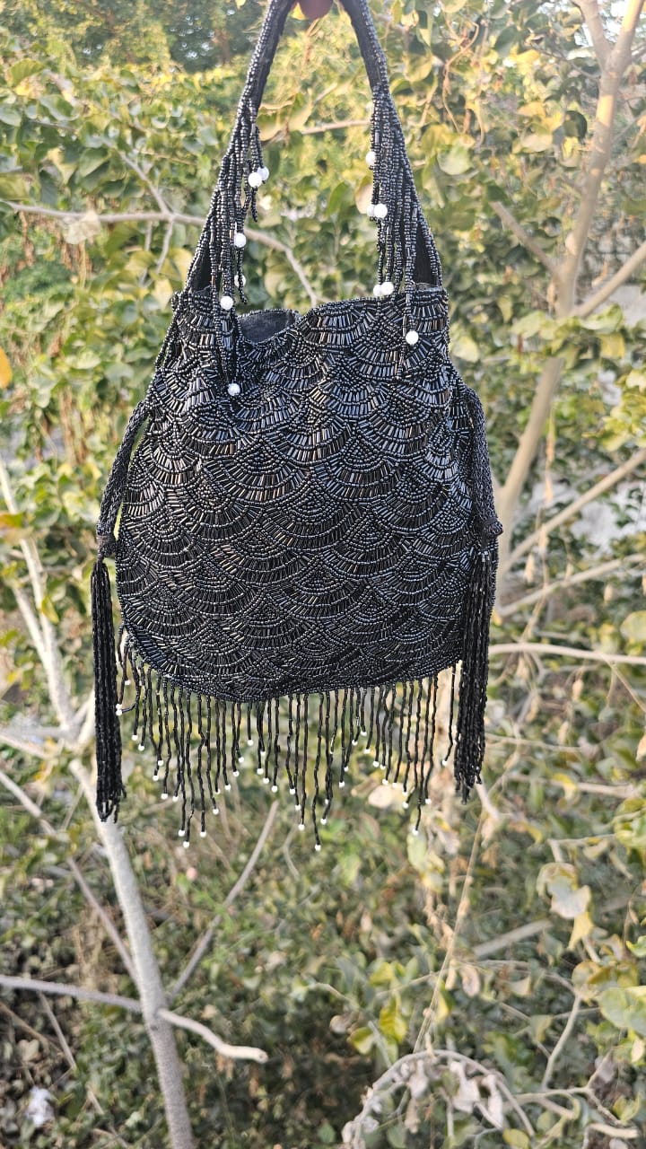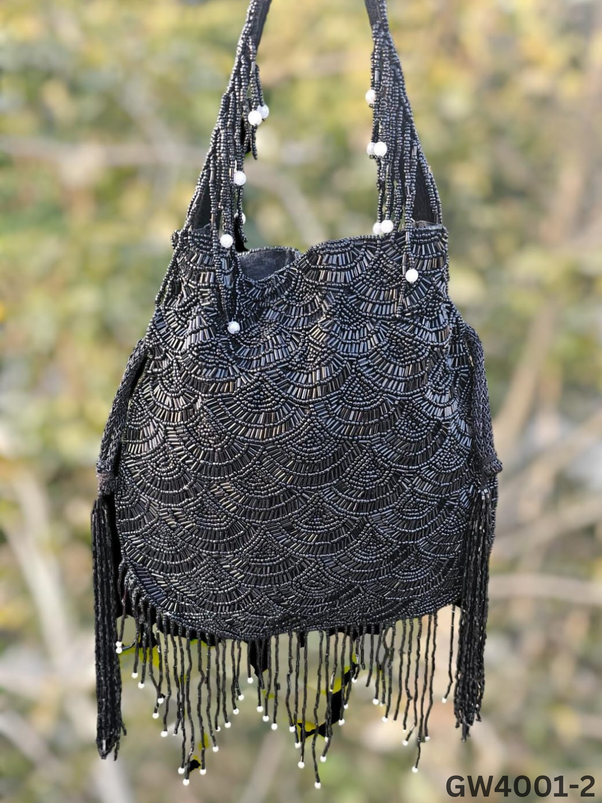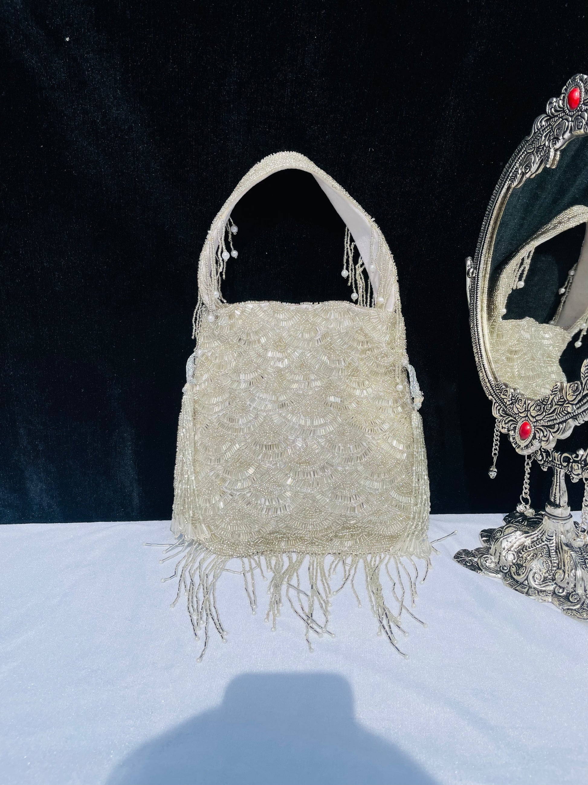 Elevate your ethnic look with this stunning handcrafted beaded potli from Trendy Crafts. Featuring a luxurious chevron pattern made with shimmering beads in shades of gold, ivory, lavender, mint, and pink, this potli is the perfect blend of elegance and tradition. The golden drawstring with intricate circular tassels adds a regal charm, making it ideal for weddings, parties, and festive occasions. Soft satin lining inside ensures your essentials are carried in style.